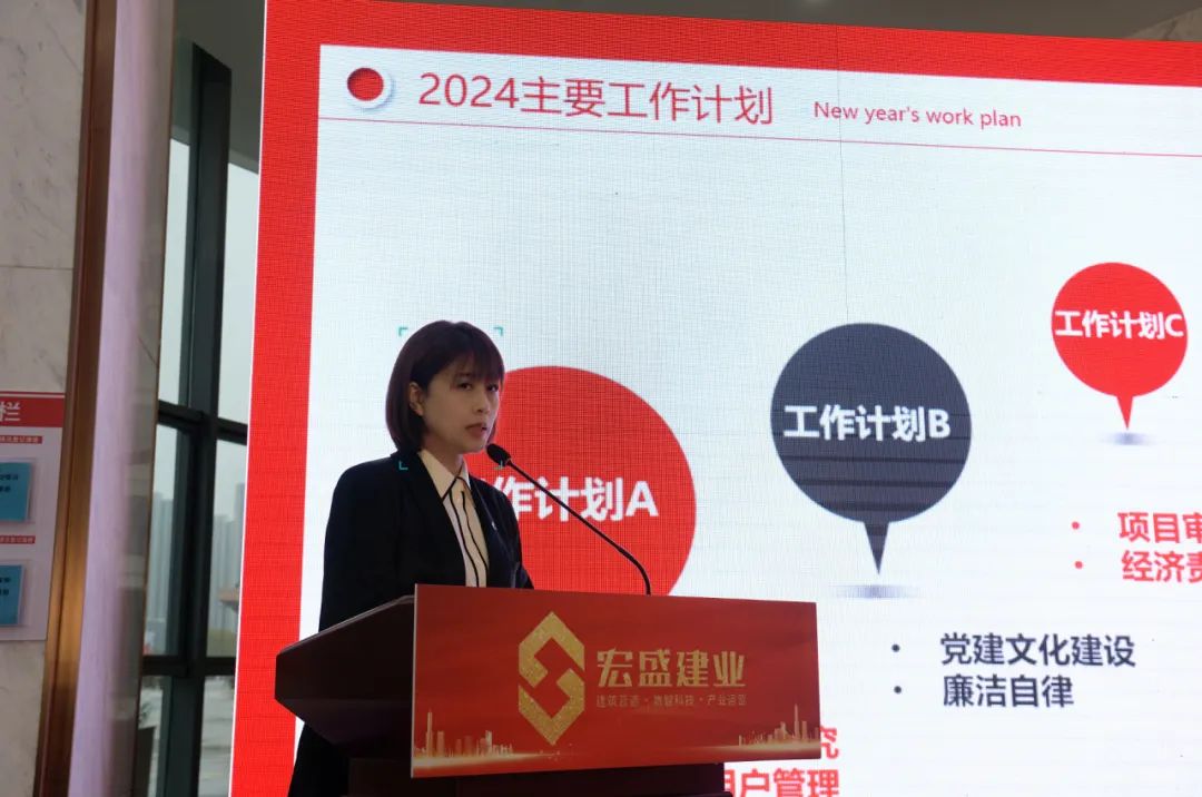 會上,集團黨委書記、副董事長、總裁周金旺作主題為“新戰(zhàn)略 新起點 以終為始 再戰(zhàn)新高”的年度工作報告,從黨建品牌、創(chuàng)優(yōu)創(chuàng)標、客戶服務(wù)及內(nèi)部團隊培養(yǎng)四方面總結(jié)一年來的成果。通過經(jīng)營數(shù)據(jù)、財務(wù)數(shù)據(jù)和成本分析、人力資源分析、項目管控分析、風(fēng)險管控分析五大方面進行了全面剖析,并提出2024年是宏盛新的起點,我們的戰(zhàn)略將全面升維。